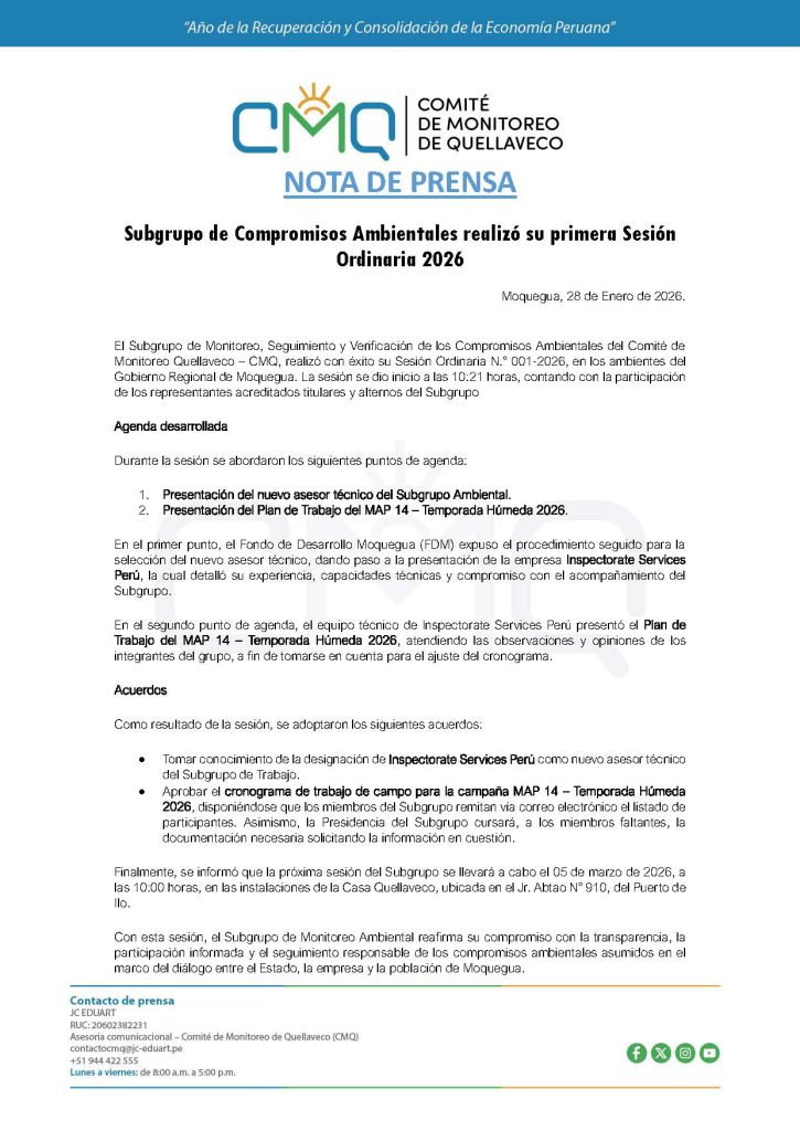 El Subgrupo de Monitoreo, Seguimiento y Verificación de los Compromisos Ambientales del Comité de Monitoreo Quellaveco (CMQ) realizó
